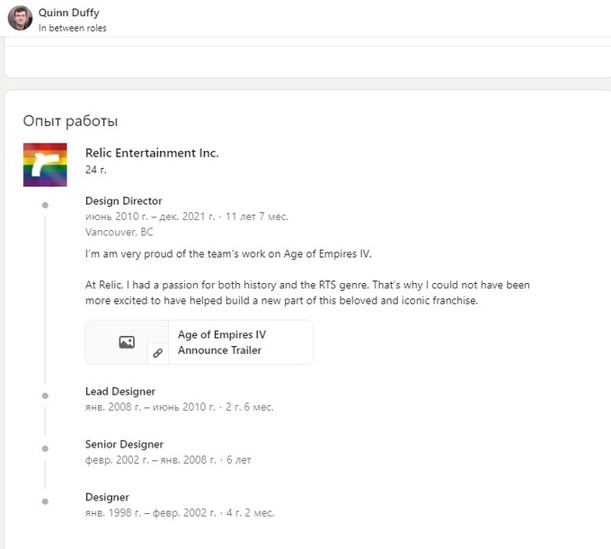 СМИ обратили внимание на LinkedIn Куинна Даффи, дизайн-директора Age of Empires IV и ветерана студии Relic Entertainment. В своем профиле он отметил, что с декабря 2021 года более не работает в компании.